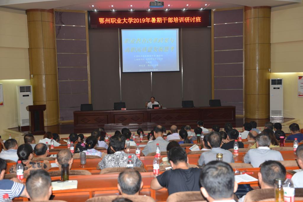 本网讯(记者 何建华/文 双全/摄)8月25日上午,我校2019年暑期干部培训研讨班在主教学楼学术报告厅顺利开班。全国著名职教专家马树超教授应邀为我校作首场《职业教育改革政策与高职质量发展思考》的专题讲座。校党委书记万国光主持开班仪式。校党委班子成员,全校副科级以上干部、二级党组织委员和基层党支部书记参加培训。