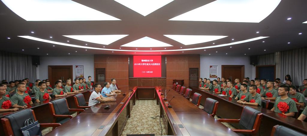 本网讯(学生记者 文倩/文 张红莲/摄)9月9日下午,我校2019年大学生征兵入伍欢送会在图书馆一楼会议室举行,96名大学生胸带大红花光荣入伍。校长周峰、副校长胡海平出席欢送会。