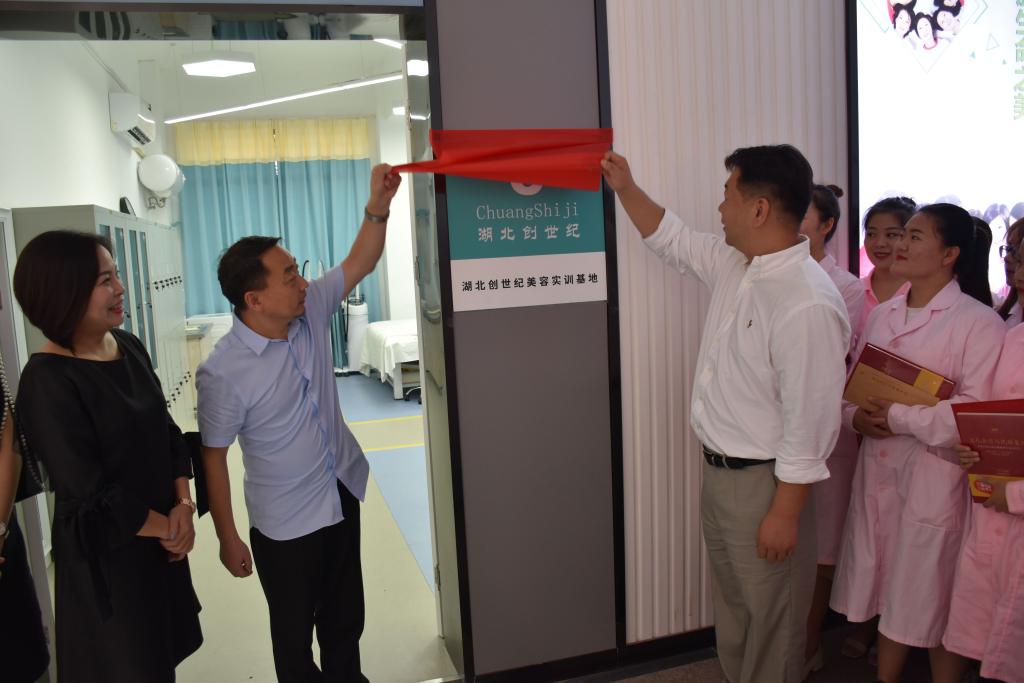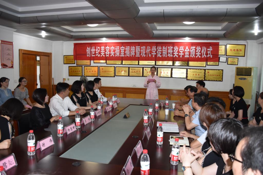 本网讯(记者 双全)9月12日,由湖北创世纪美容咨询有限公司捐建的“创世纪美容实操室”在我校医学院揭牌。校长周峰、湖北创世纪美容咨询有限公司董事长李婷女士出席揭牌仪式,并为现代学徒制班优秀学生颁发奖学金。
