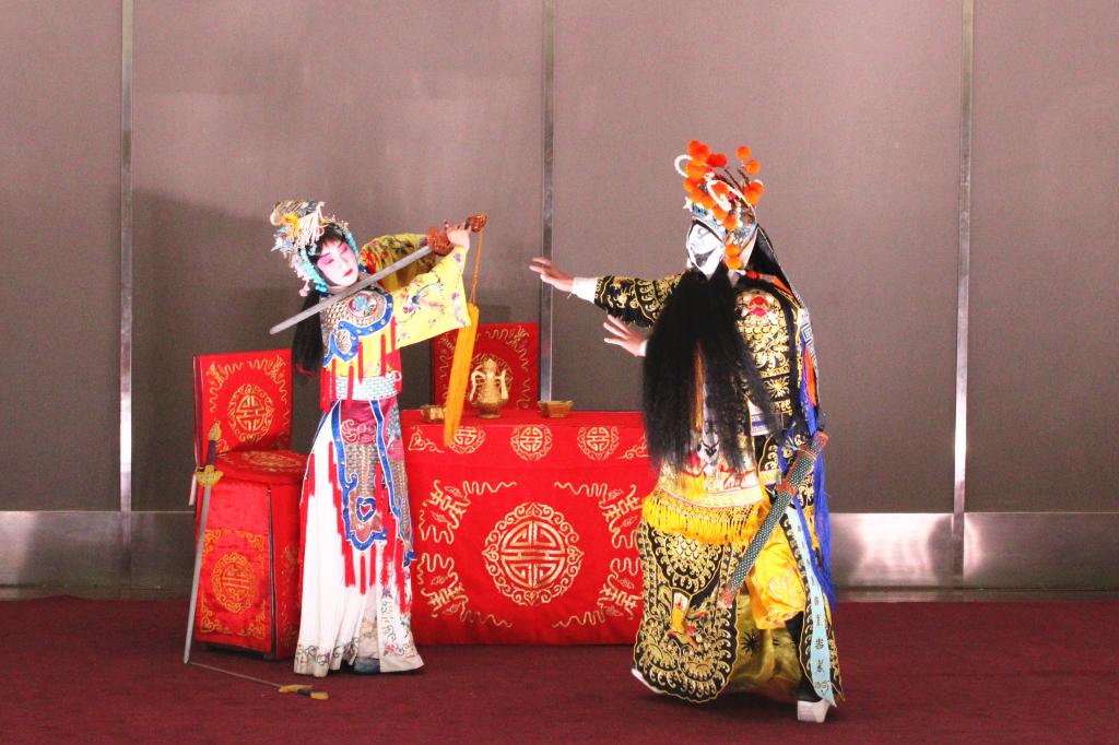 展演环节,演员们形象生动、情绪饱满的表演和夸张优美的脸谱、精美绚丽的戏服以及许多经典台词,赢得满场喝彩。京剧《霸王别姬》再现了西楚霸王项羽与虞姬之间感天动地的爱情和霸王乌江自刎前的悲壮;京剧《文昭关》演绎了春秋末期吴国大夫、军事家伍子胥的故事;传统剧目《钓金龟》是一出老旦与丑角的合作戏,弘扬了中国孝文化,鞭鞑了丑陋、邪恶与昏庸;京剧折目《三岔口》是一出滑稽逗趣的小武戏,讲述的是宋朝三关大将任堂惠为保护焦赞,与三岔口店主刘利华黑夜打斗的故事。