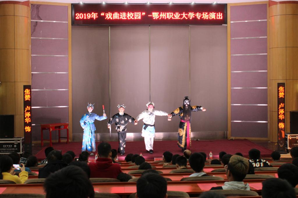 本网讯(学生记者 孙晓艳/文 邓红扬/摄)11月14日,由湖北省京剧二团承演的2019年“戏曲进校园”——鄂州职业大学专场演出在求真楼学术报告厅精彩上演。校党委副书记周岫、市文旅局副局长叶丽娅、湖北省京剧二团团长胡建铭以及我校300余名师生共同观看了此次表演。