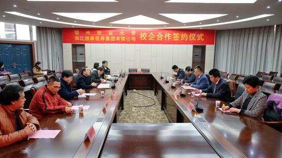 副校长杨殿生,医学院、校企合作处、招办主要负责人,浙江绿康医养集团有限公司相关工作人员参加签约仪式。