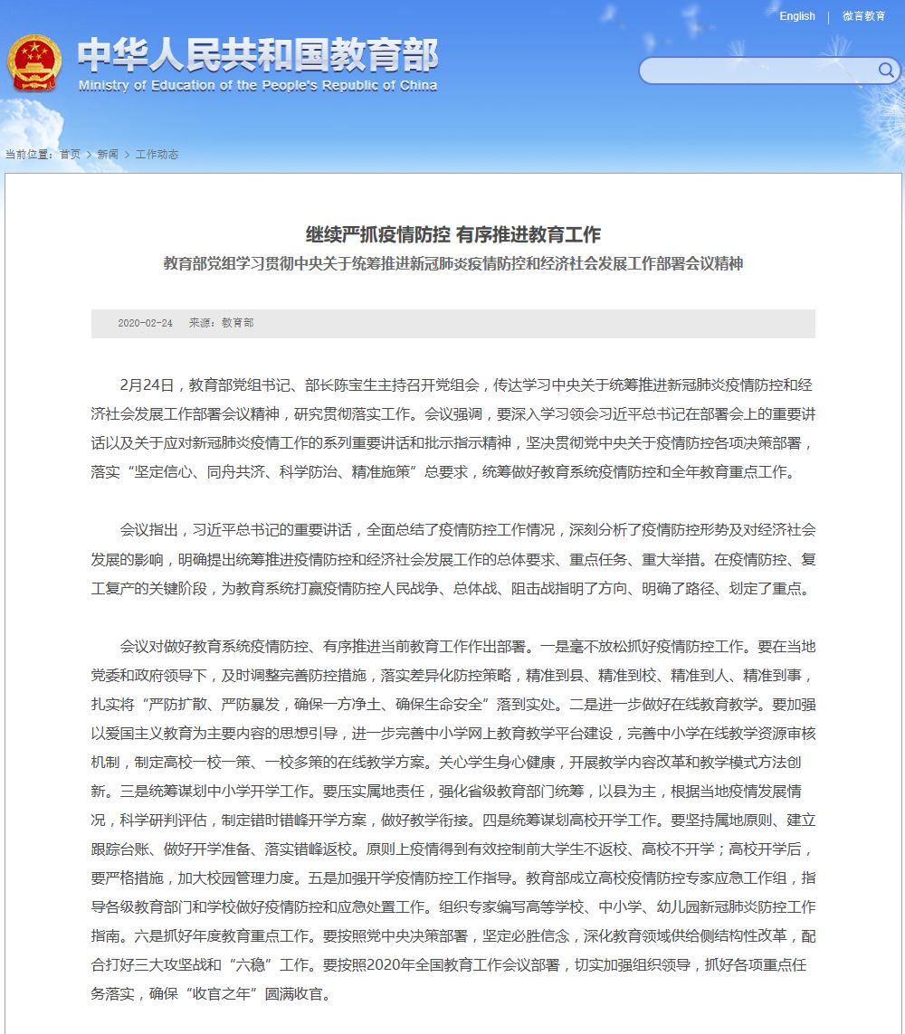 2月24日,教育部党组书记、部长陈宝生主持召开党组会,传达学习中央关于统筹推进新冠肺炎疫情防控和经济社会发展工作部署会议精神,研究贯彻落实工作。会议强调,要深入学习领会习近平总书记在部署会上的重要讲话以及关于应对新冠肺炎疫情工作的系列重要讲话和批示指示精神,坚决贯彻党中央关于疫情防控各项决策部署,落实“坚定信心、同舟共济、科学防治、精准施策”总要求,统筹做好教育系统疫情防控和全年教育重点工作。