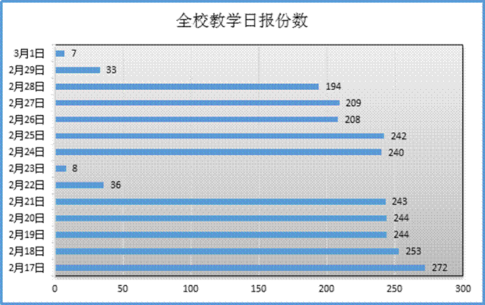 从2月17日至3月1日,全校学生信息员共提交教学日报2433份。从授课方式来看,多数老师都是采用(学习通/职教云等)平台在线教学+直播+QQ群/微信群答疑等多种方式混合教学。