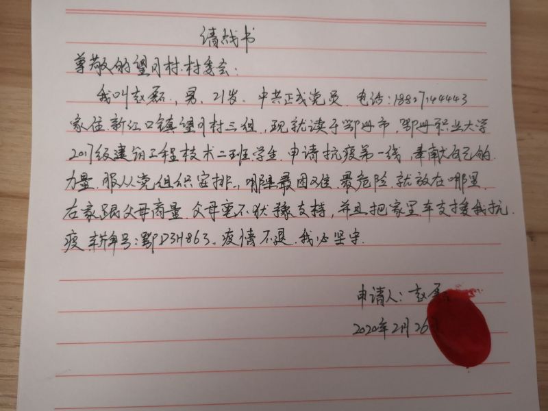 家住湖北松滋的学生党员赵磊,是一名大三的学生,原本准备毕业前的最后一个寒假,在家好好陪家人。随着松滋疫情防控升级,赵磊慎重提笔,写下了请战书……“我是一名学生党员,申请到抗疫第一线,奉献自己的力量,哪里最困难,哪里最危险,就把我放在哪里……疫情不退,我必坚守。”