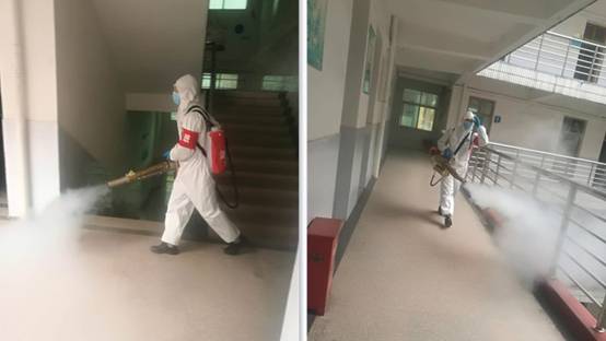 上午八点,70余名身穿白色防护服的消防官兵携带迷雾消毒机来到我校。
