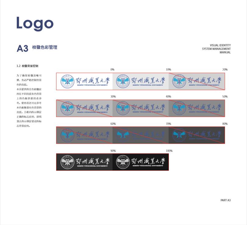 校徽应尽可能使用在白色背景上。如需使用灰色或有色背景,务必严格控制背景色亮度,校徽背景灰度大于等于30% 黑为禁止使用,以确保校徽清晰可辨。本页提供了单色黑校徽在不同亮度灰色背景上的色版,供使用者参考。方框内的示例是正确的标志应用,斜线划去的是错误应用。