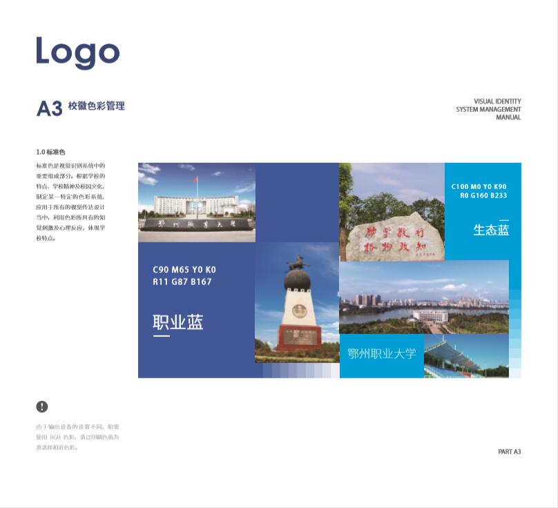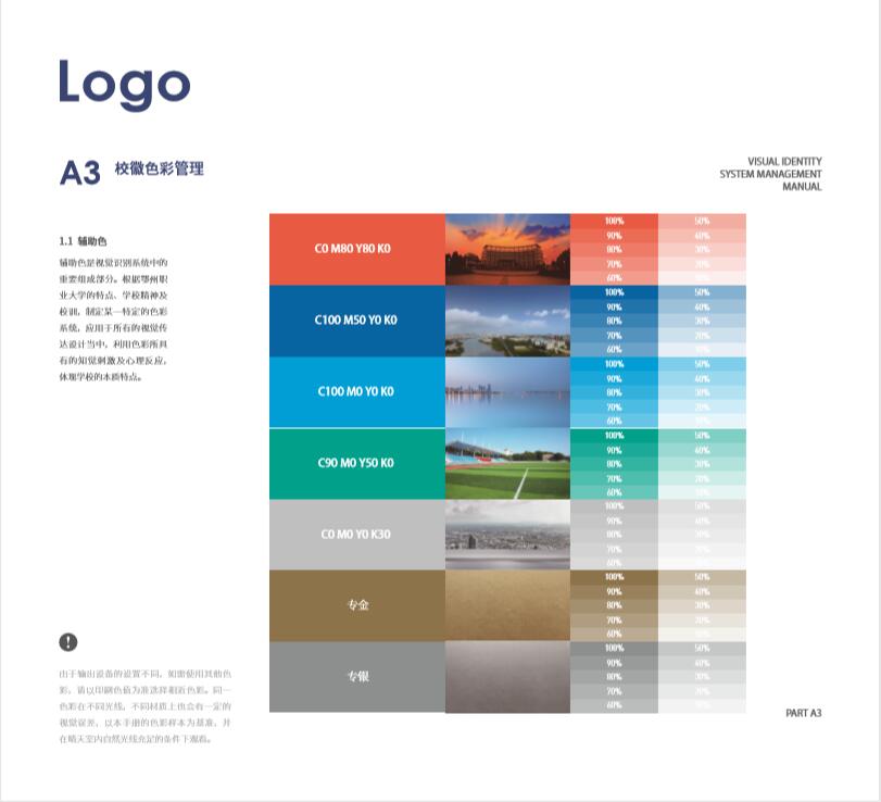 辅助色是视觉识别系统中的重要组成部分。根据鄂州职业大学的特点、学校精神及校训,制定某一特定的色彩系统,应用于所有的视觉传达设计当中,利用色彩所具有的知觉刺激及心理反应,体现学校的本质特点。