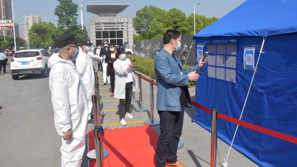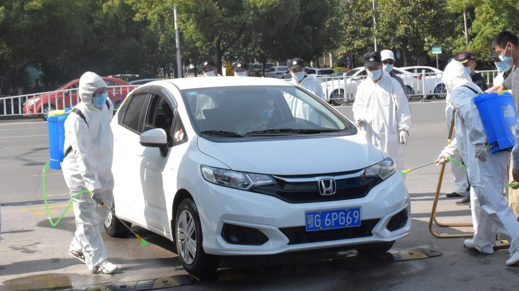 “你好,请扫描健康码!“上午9时演练开始,在校南大门门口,几十名“学生”佩戴口罩,在醒目一米隔离线上有序排队,经现场保卫人员进行身份核验、扫描健康码、消毒、体温检测后进校。进入校园的车辆也在保卫人员的安排下进行检查、消毒、测温后入校。