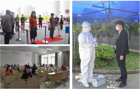 5月6日起,我校中职学院毕业班347名学生即将复学。此次演练各部门人员按场景、按流程、分角色进行演练;辅导员扮演学生角色,全程参与。演练设置了校园南大门、五号教学楼、树惠园食堂和学生公寓等应急演练实操点。演练内容包括学生返校报到、进入教学楼上课、食堂就餐、进入宿舍及学生在校期间发热应急处置五个环节,并在相关场所设置了测温点、排队间隔线和临时留观点,开展了身份确认、健康码查验、体温监测、现场消毒、隔离观察等相关场景的流程演练。