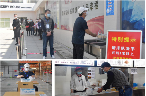 在树惠园食堂,就餐出入通道分离,就餐人员在洗手、测温、脚踩消毒毯、手部消毒后进入食堂,随后按引导标线到取餐区取餐,取餐后单人单桌落座就餐。