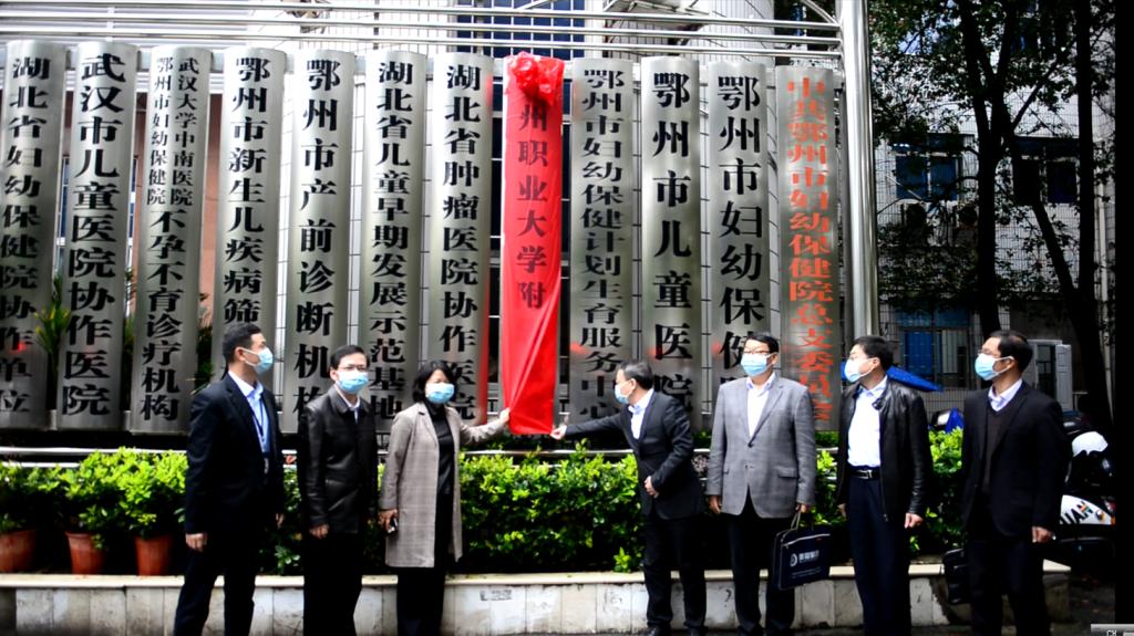 签约仪式结束后,与会人员移步至医院门口,在热烈的掌声中,周峰与市卫健委党组主要负责人共同为鄂州职业大学附属医院揭牌。