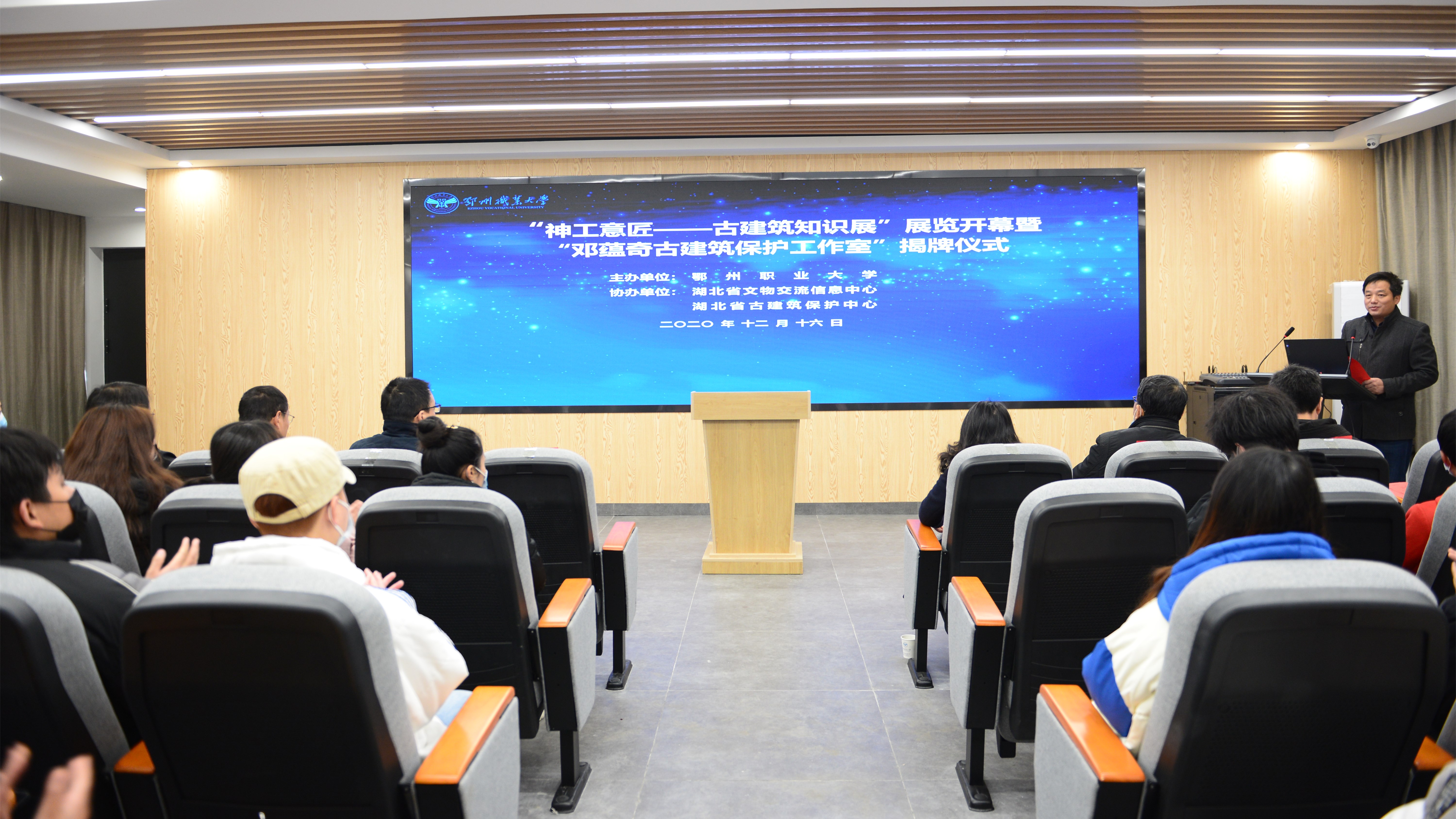 本网讯(记者 何建华)12月16日上午,“神工意匠——古建筑知识展”开幕及邓蕴奇古建筑保护工作室揭牌仪式在我校建筑工程学院举行。湖北省文物交流信息中心、古建筑保护中心副主任龙永芳,李琦,湖北明清古建筑博物馆常务副馆长范小宁,湖北省古建筑保护中心勘察设计部主任邓蕴奇及相关工作人员,副校长杨殿生出席活动,校企合作处、建筑工程学院相关负责人及学生、教师代表参加了揭牌仪式。
