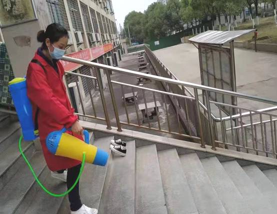 宿管中心宿管员对宿舍楼内外进行84喷雾消毒
