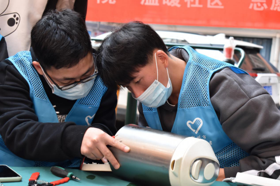 上午9时,身穿志愿服的学生们已经将桌椅、工具摆好,醒目的横幅吸引了不少市民驻足。在志愿者们耐心地解说下,不少市民纷纷从家里拿来坏损的电器和破旧的衣物,请志愿者们帮忙维修、缝补。