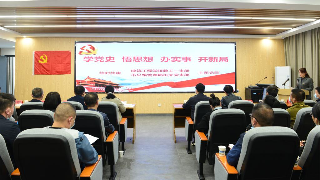 本网讯(记者何建华)4月22日下午,建筑工程学院教工一支部与结对共建单位市公路管理局机关党支部联合开展的“学党史、悟思想、办实事、开新局”主题党日活动在我校建筑工程学院实训中心一楼会议厅举行。副校长王红山,市公路局机关全体党员、公路路政支队、路桥公路公司、养护公司、规划设计院党组织主要负责人,建筑工程学院党总支成员及教工一支部全体党员参加活动。