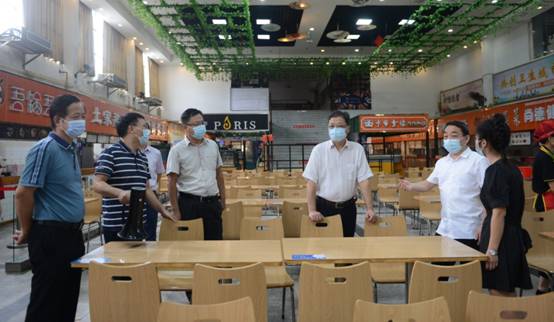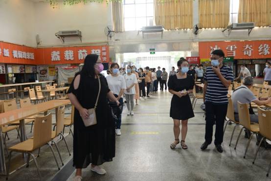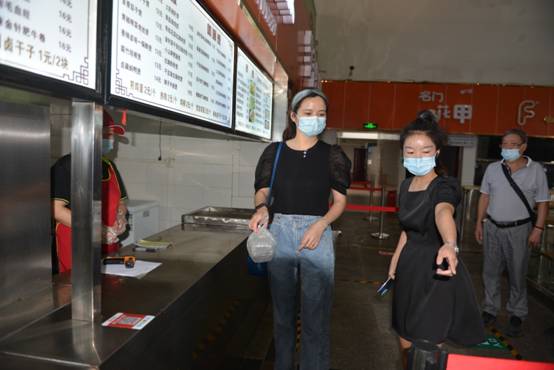 在学校食堂门口,学生依次排队,经洗手、测温后有序进入食堂,保持1米间隔排队到窗口购买饭菜,并按一人一桌同向而坐就餐,或购买后从食堂出口离开回宿舍就餐。