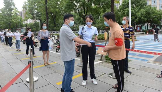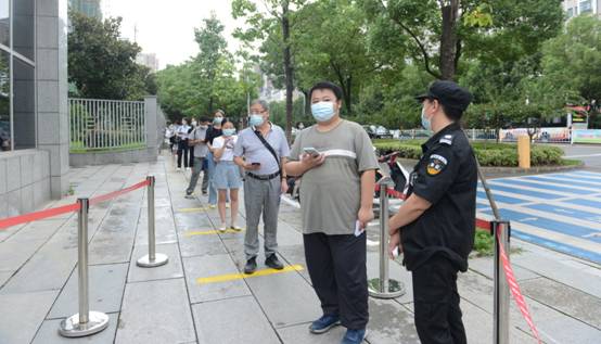 演练现场,在学生返校入校环节,由教职工扮演的“学生”佩戴口罩,到达校园南大门,在候检区按照地贴位置间隔1米依次排队等候,向工作人员出示健康码、行程码和48小时核酸检测证明,经测温无异常后进入校园。若无核酸检测证明或持超过48小时以上核酸检测者,则由工作人员指引到学校安排的临时核酸检测点,经检测合格后方可入校。