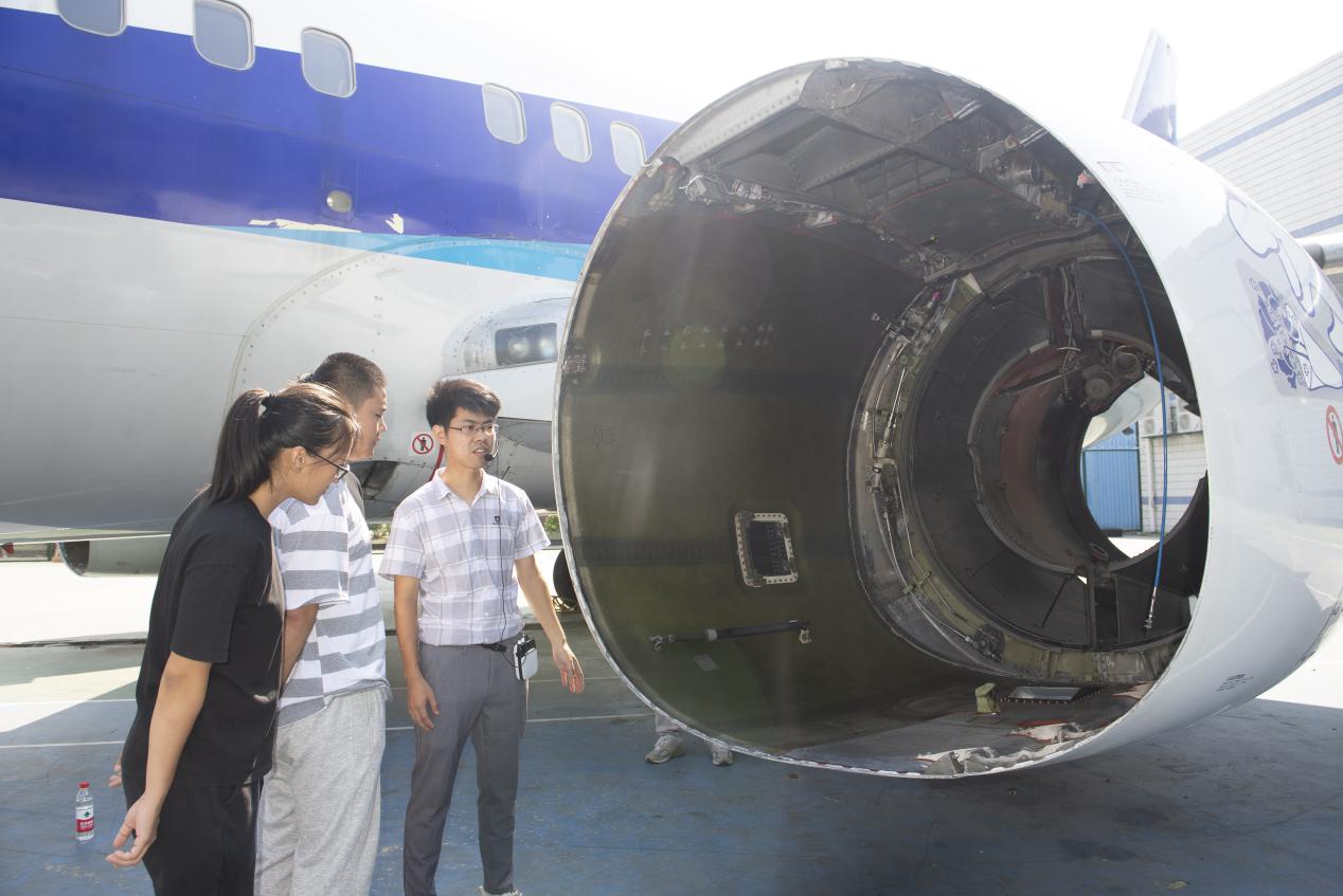 “同学们,今天我们来认识一下这架波音737-500型民用客机的构造……”9月3日上午,新学期刚开学,大飞机前,航空工程学院的学生们正欣喜地在老师的带领下参观学习。