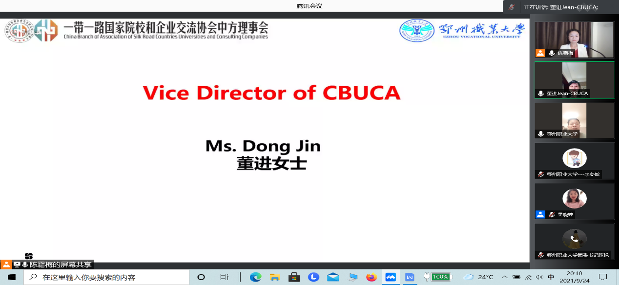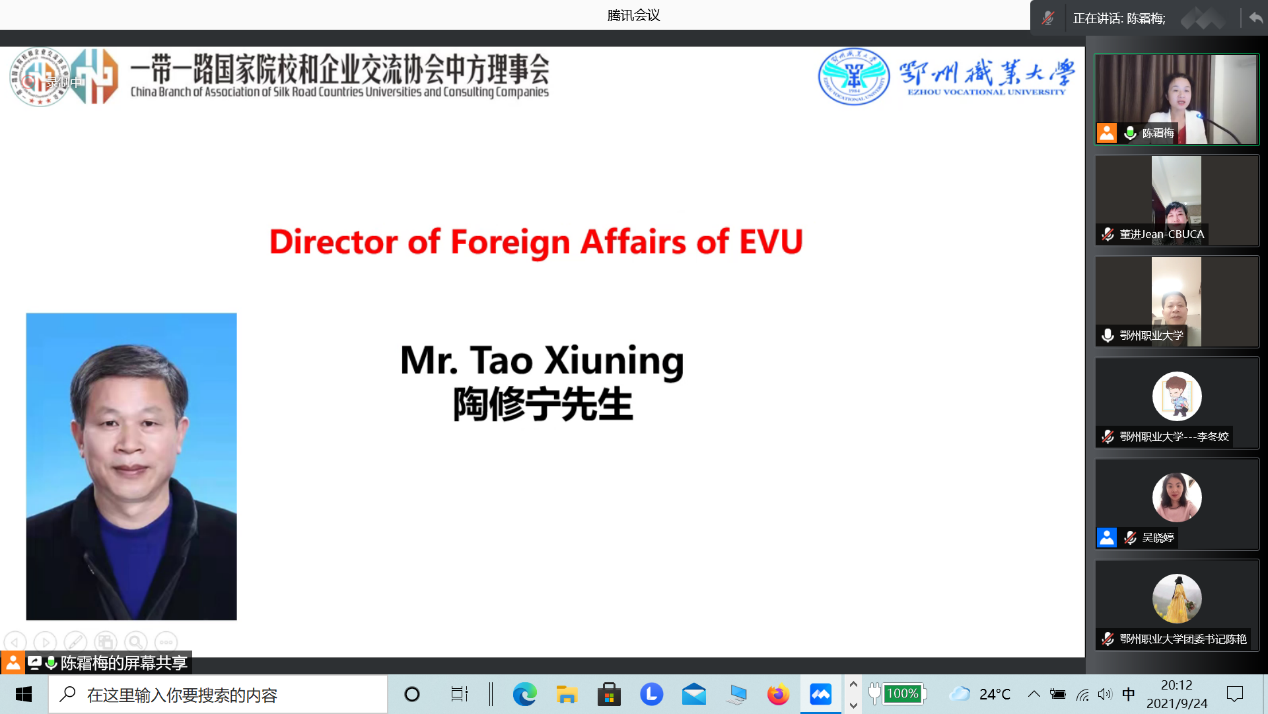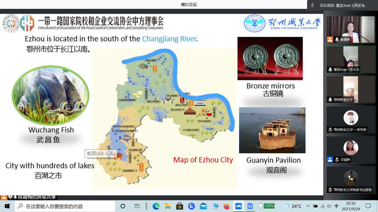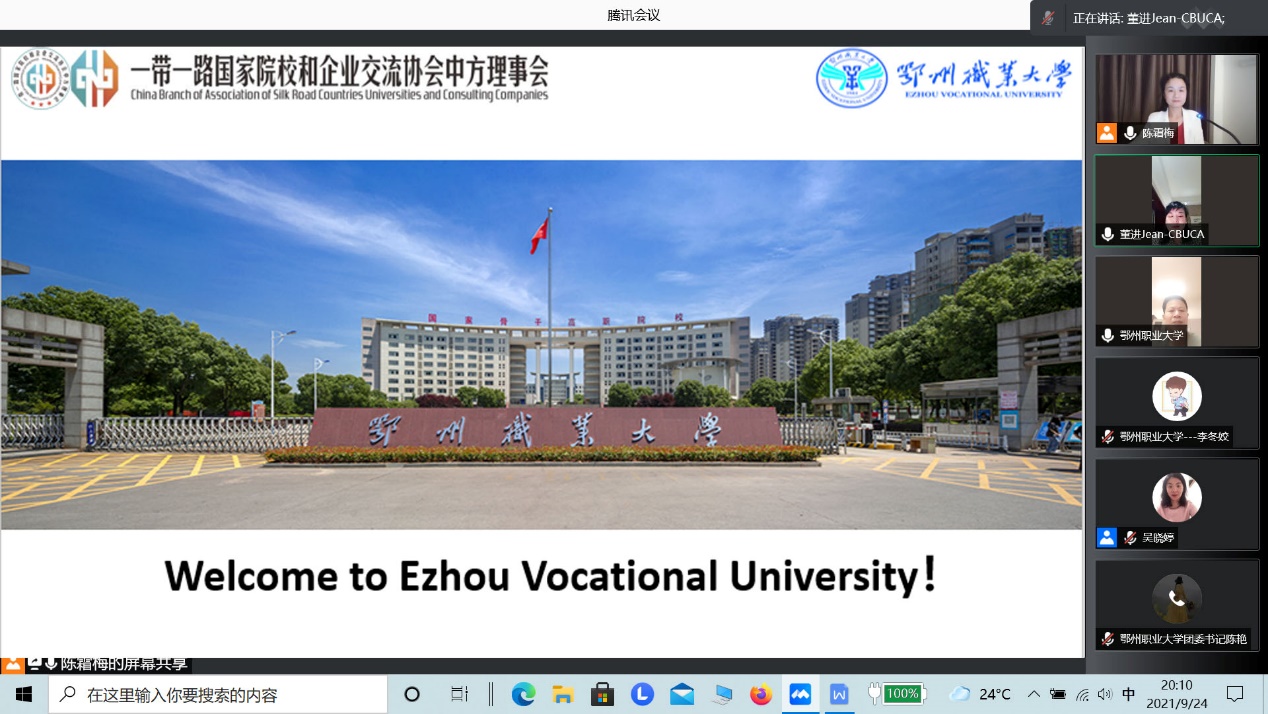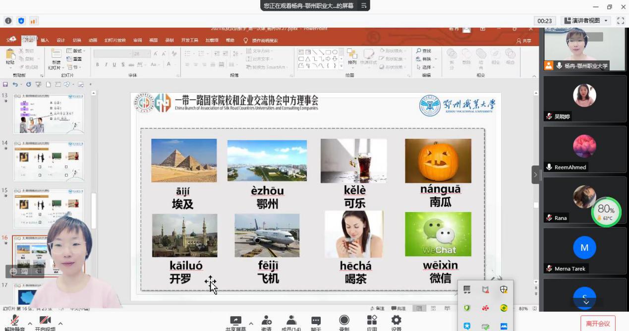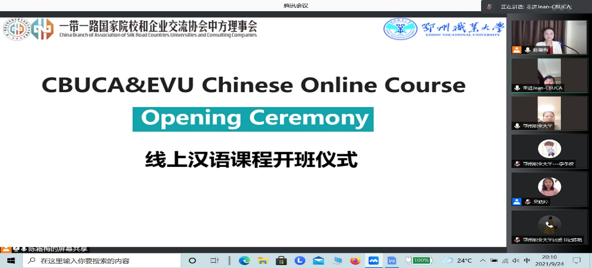 本网外事处消息 9月24日,鄂州职业大学国际汉语培训基地举行海外汉语在线教学实践(埃及班)开班仪式。 “一带一路”国家院校和企业交流协会中方理事会秘书长董进、办公室主任李玲,鄂州职业大学的国际汉语教师陈霜梅、周晓兰、吴晓婷、杨冉、李冬姣、夏子宜以及15名埃及大学生参会。鄂州职业大学外事处处长陶修宁在开班仪式上致辞。