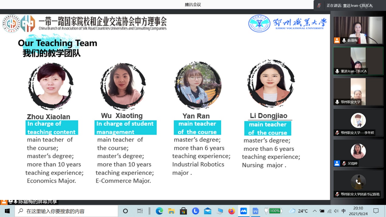 国际汉语教师代表陈霜梅介绍了学校的办学特色、专业设置和本次的课程安排情况。参与本期职业院校海外汉语在线教学实践课程的周晓兰、吴晓婷、杨冉和李冬姣4位老师均已取得了《国际汉语教师证书》(初级-胜任各等级全课型教学)。