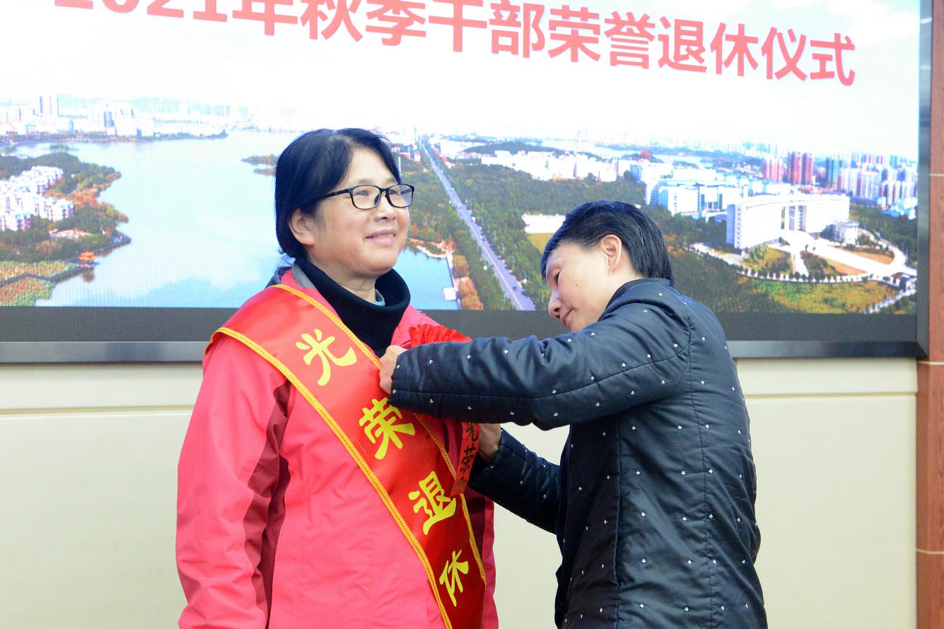周岫为退休同志佩戴荣誉红花、绶带,颁发退休证书及纪念品。希望他们继续保持党员本色和教育者风范,有所作为,并祝愿他们光荣退休后生活更加丰富、美好。