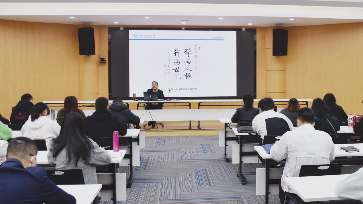 开班仪式后,校长周峰以“学为人师,行为世范”为题,为新进教职工讲授培训第一堂课。