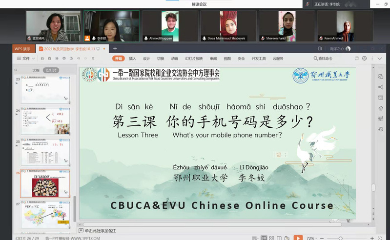 国际汉语师资培训基地由我校与“一带一路”国家院校和企业交流协会中方理事会、国际汉语考教结合研究中心合作打造。该课程是国际汉语师资培训基地的第一批在线教学实践,由我校4名国际汉语教师为埃及中文大学的15位大学生在线教授HSK1级口语课程。