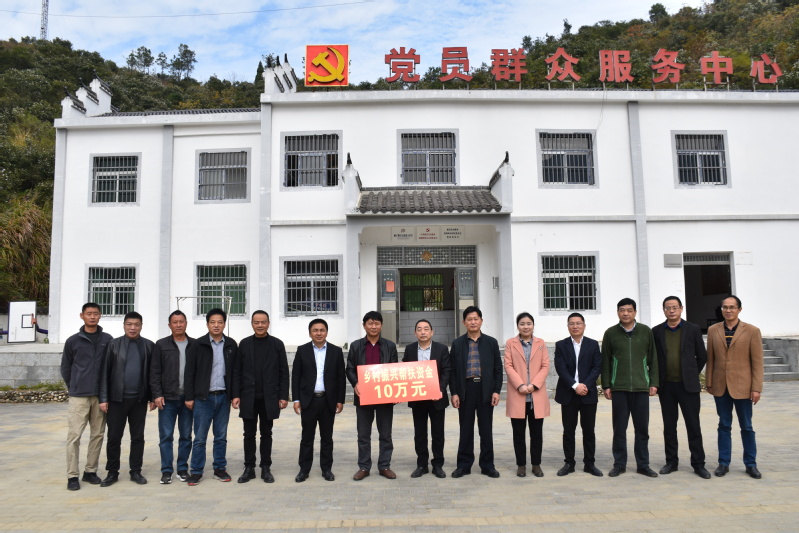 在棠树岭村部,周峰把10万元乡村振兴帮扶资金交付到村书记王立喜手中。