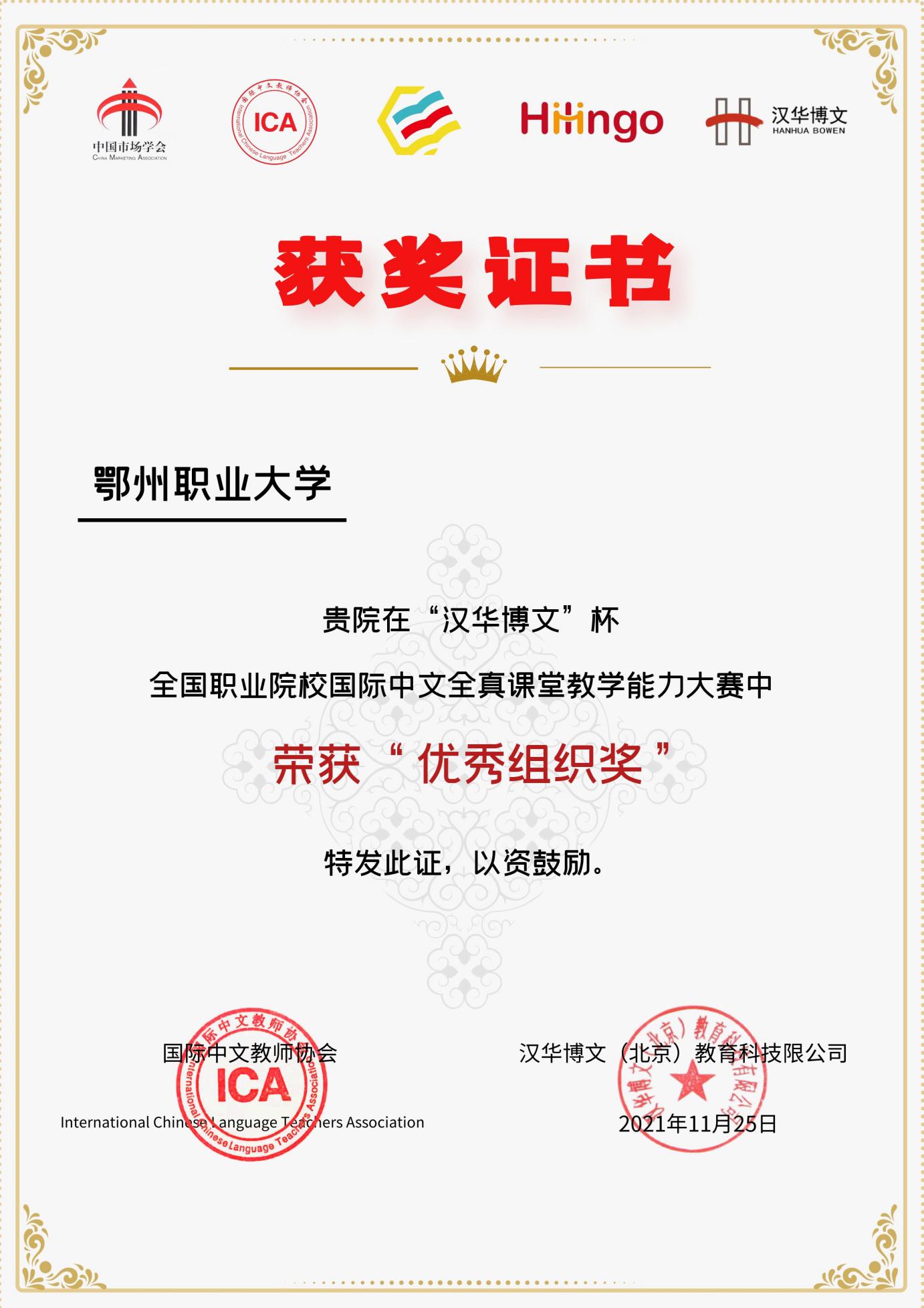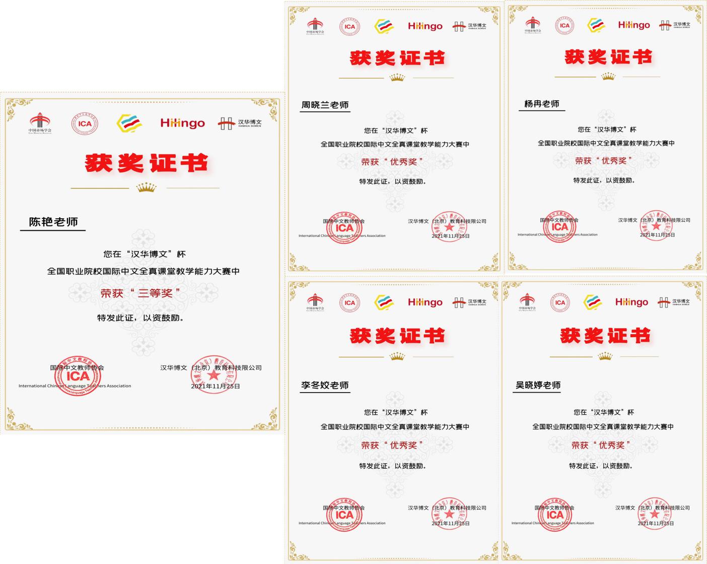 本网外事处消息 11月25日,首届“汉华博文”杯全国职业院校国际中文全真课堂教学大赛颁奖仪式在线上举行,我校获得“优秀组织奖”,我校参赛教师陈艳获三等奖、周晓兰、杨冉、李冬姣、吴晓婷获优秀奖。