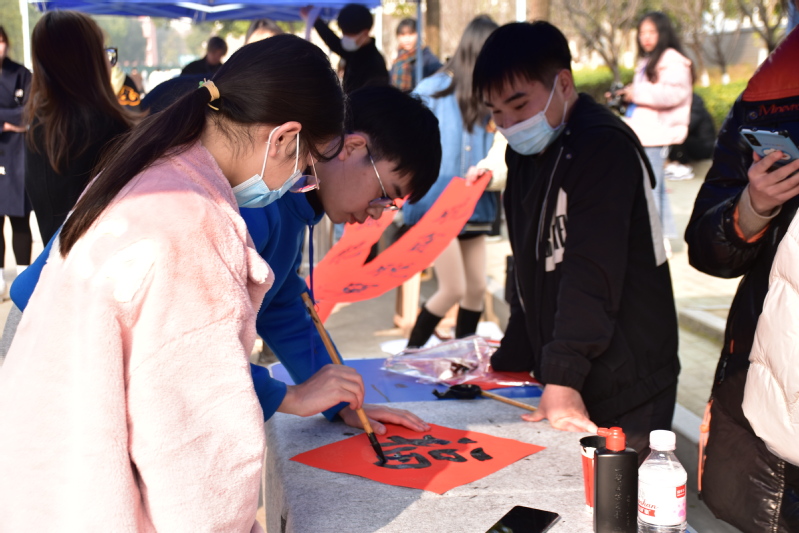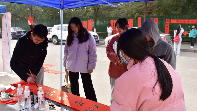 本网讯(学生记者 蒋丽/文 张小容/摄)12月9日上午,校书法协会成员在行知楼中轴线挥毫泼墨举行“迎元旦 送祝福”书法创作活动。