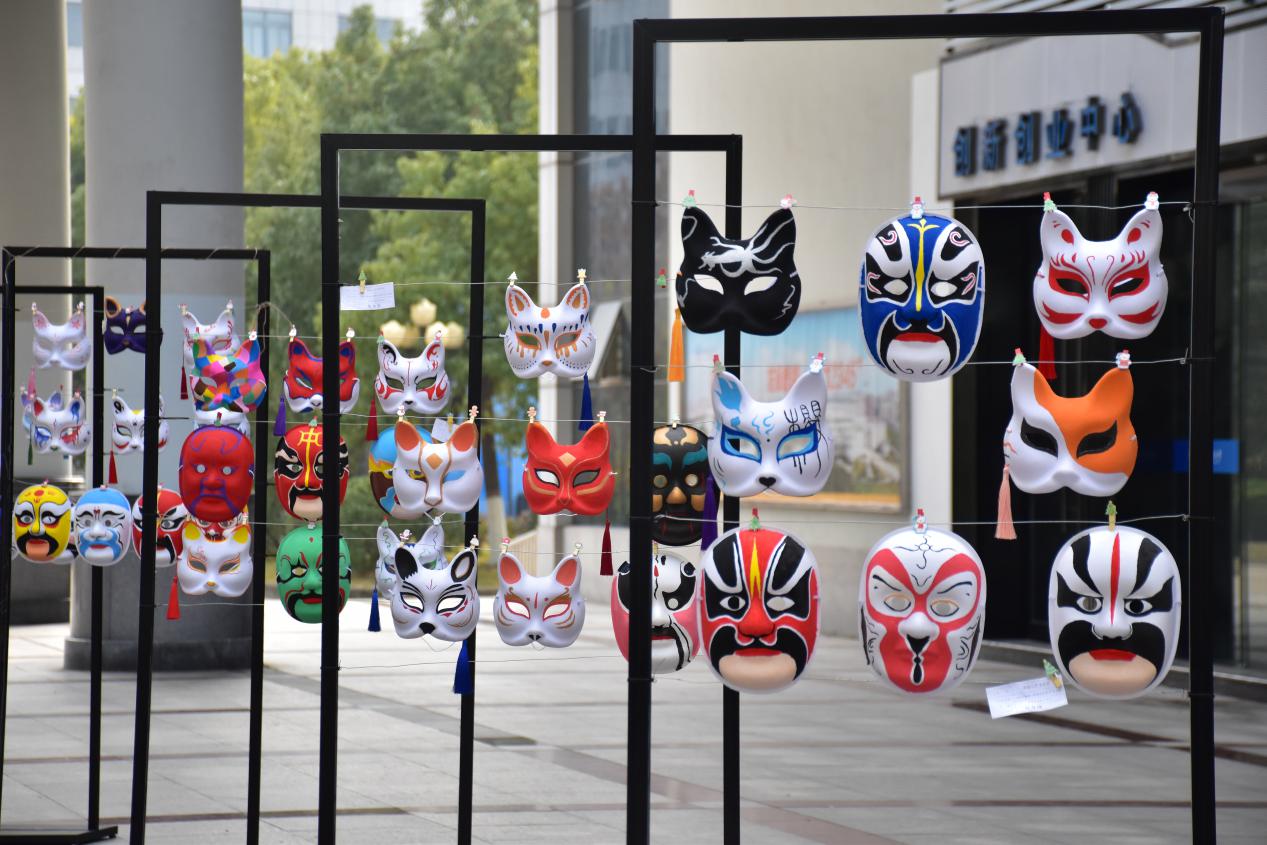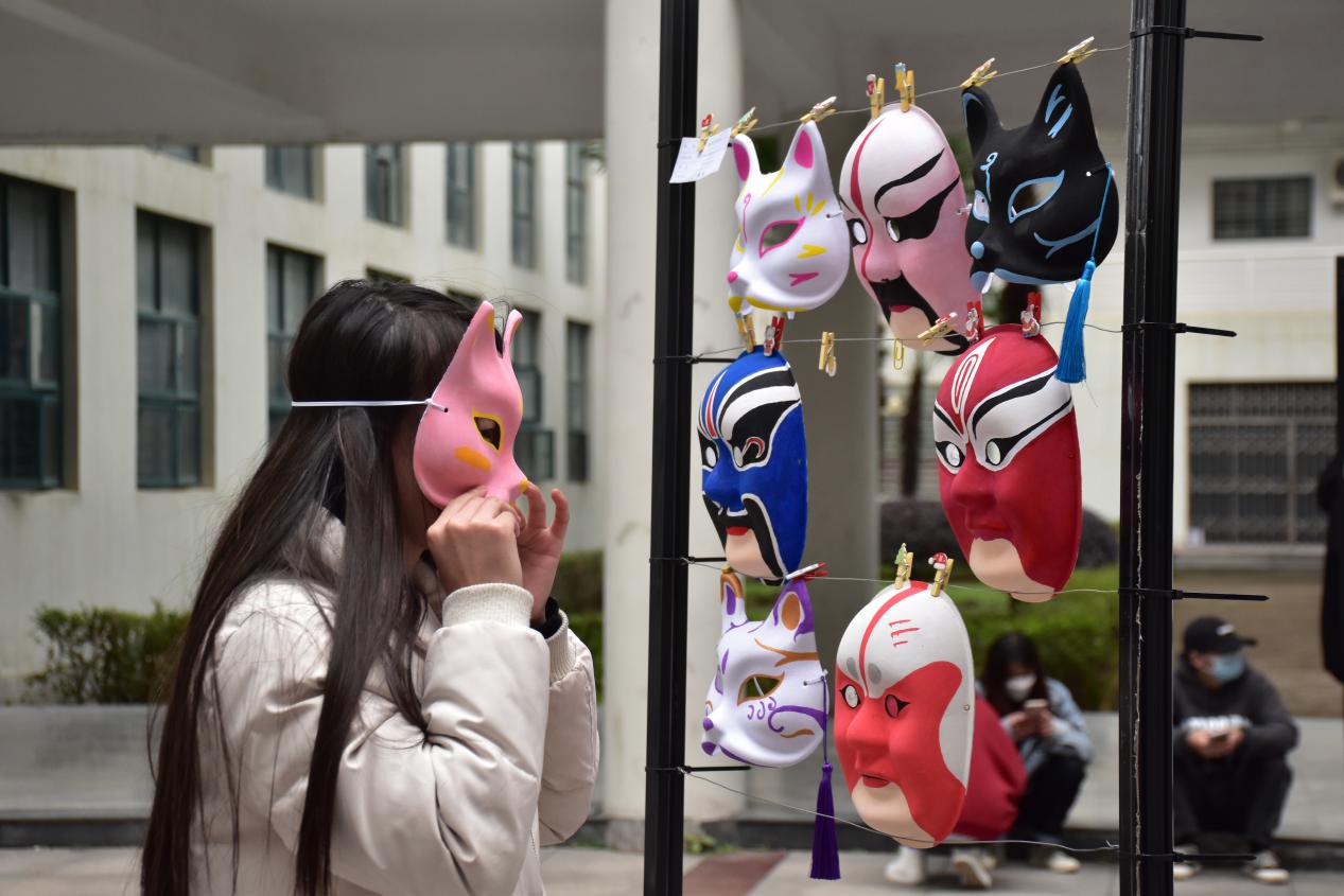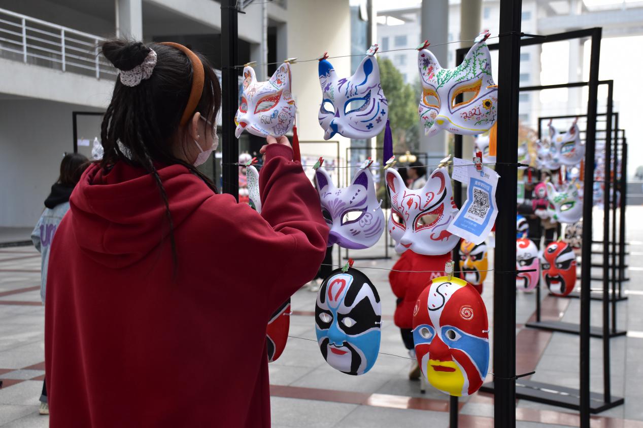 现场展销的手工面具结构设计多样、色彩大胆鲜明,主要分为京剧脸谱和动漫形象脸谱两类。其中,京剧脸谱的设计者将中国传统文化元素与现代美学相结合,从脸谱中的“离形”、“取形”、“传神”三个方面生动形象地表现出脸谱的有谱有法。动漫脸谱的设计者从经典动漫形象入手,融入现代开放时尚元素,进行多方面、多类型的二次创造加工。这些富有创造力和想象力的作品给人以强烈的视觉震撼和艺术感染力,吸引了不少同学驻足围观,连连称赞。