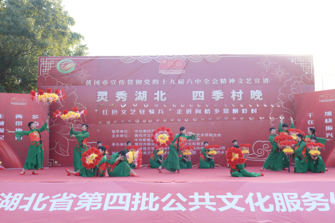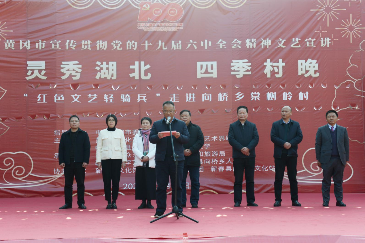 本网组织部消息 12月17日,蕲春县向桥乡棠树岭村广场上人头攒动,锣鼓喧天,热闹非凡。由中共黄冈市委宣传部指导,鄂州职业大学、黄冈市文化和旅游局、黄冈市文学艺术界联合会、中共蕲春县委宣传部主办,黄冈市群众艺术馆、蕲春县文化和旅游局、向桥乡人民政府承办的“灵秀湖北·四季村晚”黄冈市“红色文艺轻骑兵”宣传贯彻党的十九届六中全会精神文艺宣讲活动在这里隆重举行。校党委副书记周岫出席本次活动。