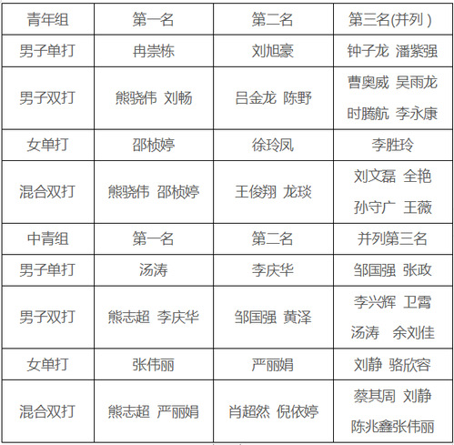 比赛分青年组和中年组两个组别,共有男单、女单、男双、女双以及混双五个项目。首轮采用分组循环赛制,第二阶段采用淘汰赛制,决出相应名次。经过50多场激烈的角逐,决出了一、二、三等奖。