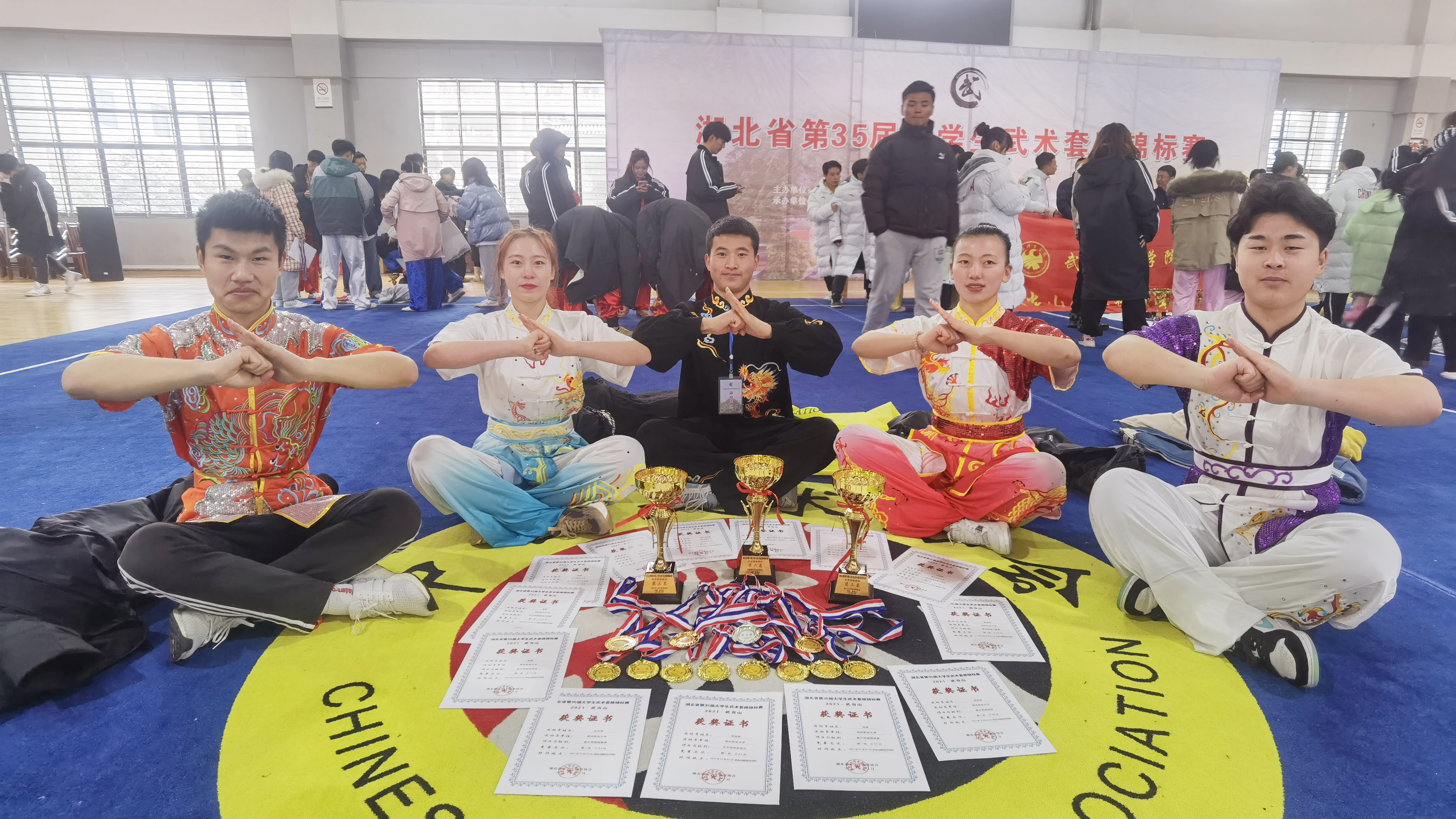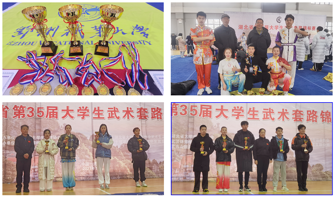 本网体育课部消息 湖北省第35届大学生武术套路锦标赛于12月26日在武汉体育学院武当山国际武术学院综合训练馆落下帷幕。来自全省20余所大学的300余名运动员、教练员和裁判员参加了大赛。在为期三天的比赛里,我校6名学生参加丙组比赛共斩获11金1银,并取得丙组男子团体第三、女子团体第二和混合团体第二的优异成绩。