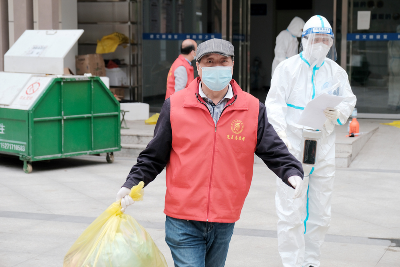 一整栋楼,1000多名学生,每天的餐食、物资转运工作量都很大。特别是每天的生活垃圾常常堆满好几个垃圾桶,钟芝和老师不怕脏、不怕累,和其他老师一起,每天来来回回跑上许多遍,将垃圾一一转运到指定的垃圾箱中。