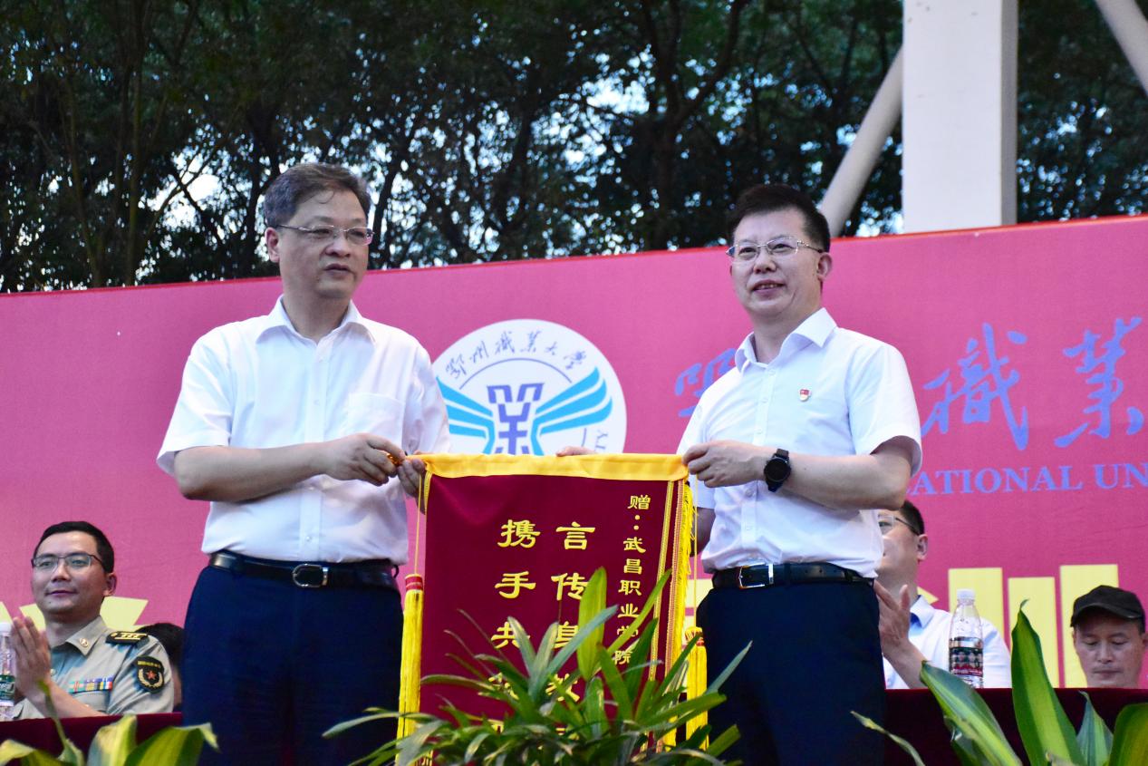 本网讯(记者 双全)6月27日晚,我校在西区运动场举行2021级学生军训成果汇报,2021级全体学生以昂扬的斗志、严整的军姿展示了他们两周刻苦训练的成果。校党委书记万国光向承训单位赠送了锦旗,校长何保华在大会上致辞。