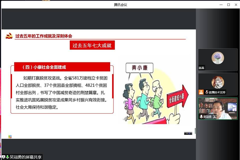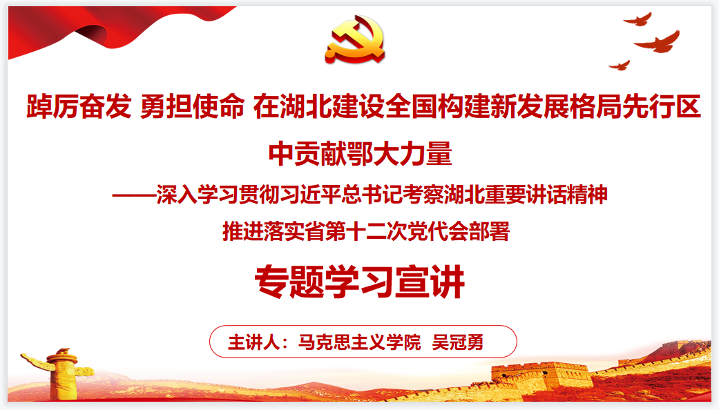 本网讯(记者 何建华)9月29日下午,我校开展线上省第十二次党代会精神理论宣讲,传达学习习近平总书记考察湖北重要讲话精神和推进落实省第十二次党代会精神。宣讲会由马克思主义学院教师吴冠勇主讲,2020级、2021级学生和教师参加学习。