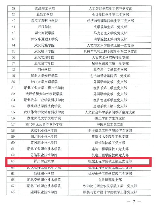 本网讯 近日,湖北省委教育工委公布了全省高校党建工作标杆院系、样板党支部培育创建单位名单,我校机械工程学院教师三支部被确立为全省高校党建工作样板支部培育项目建设单位。