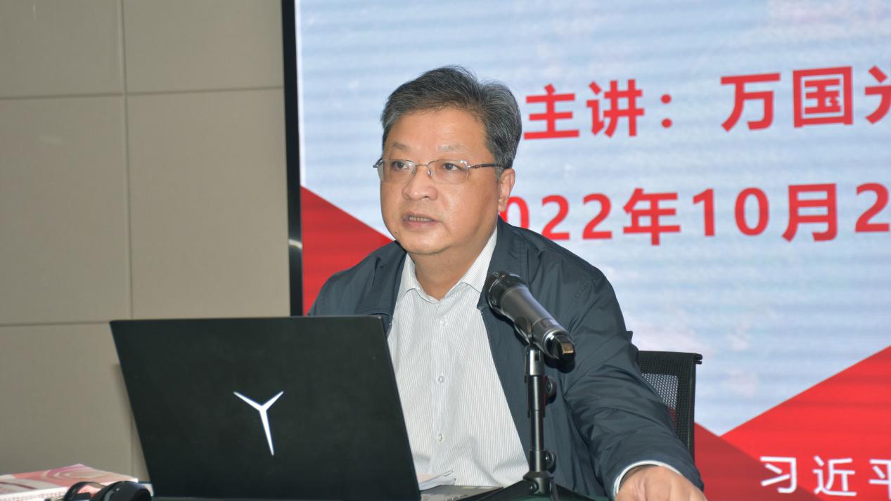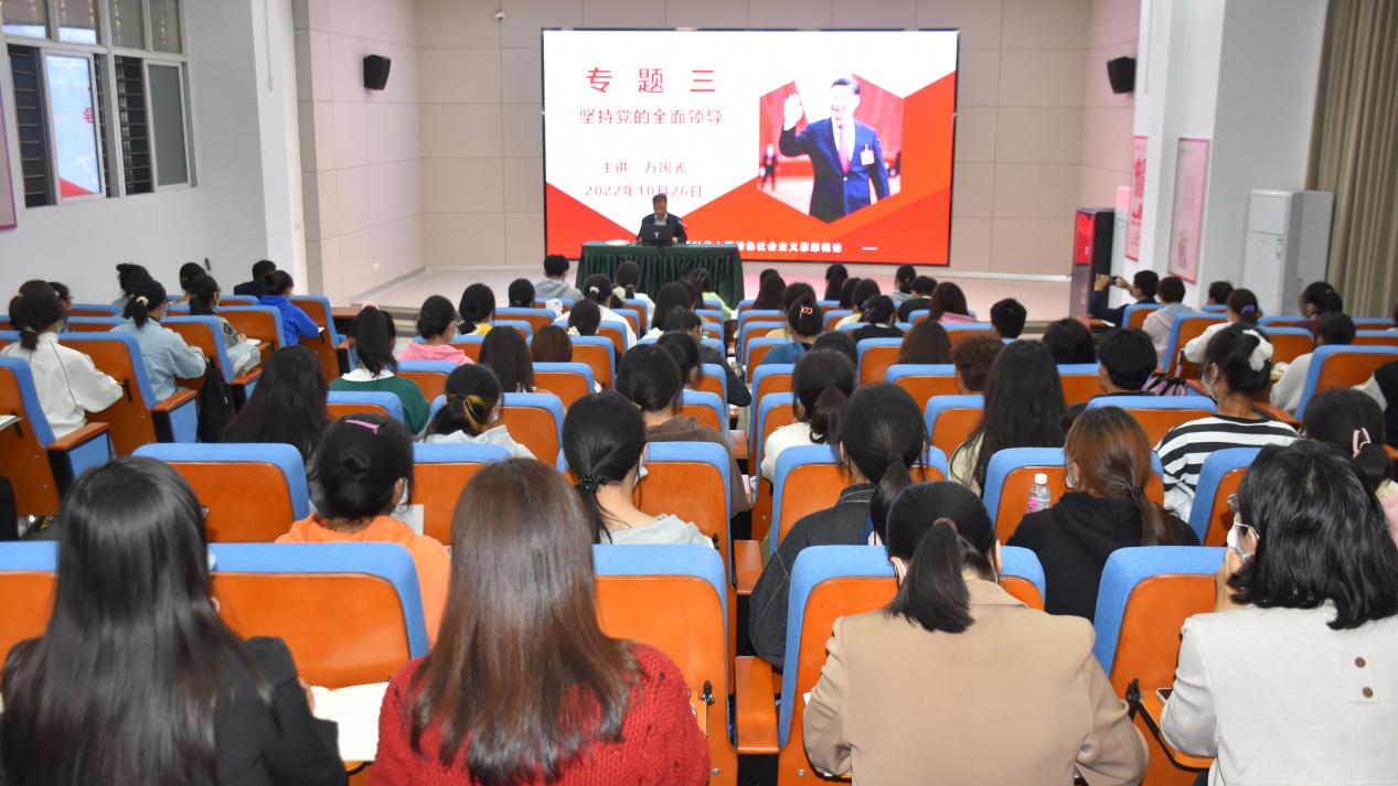 万国光以《习近平新时代中国特色社会主义思想概论》课程专题三——坚持党的全面领导为题,从全面推进中华民族伟大复兴关键在党、党和国家事业不断发展的“定海神针”、坚持和加强党的全面领导三方面为师生进行了精彩阐述。