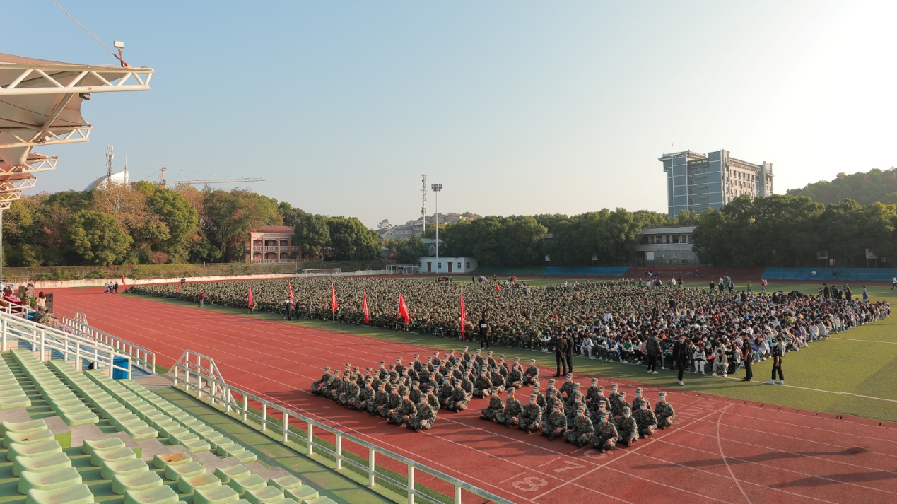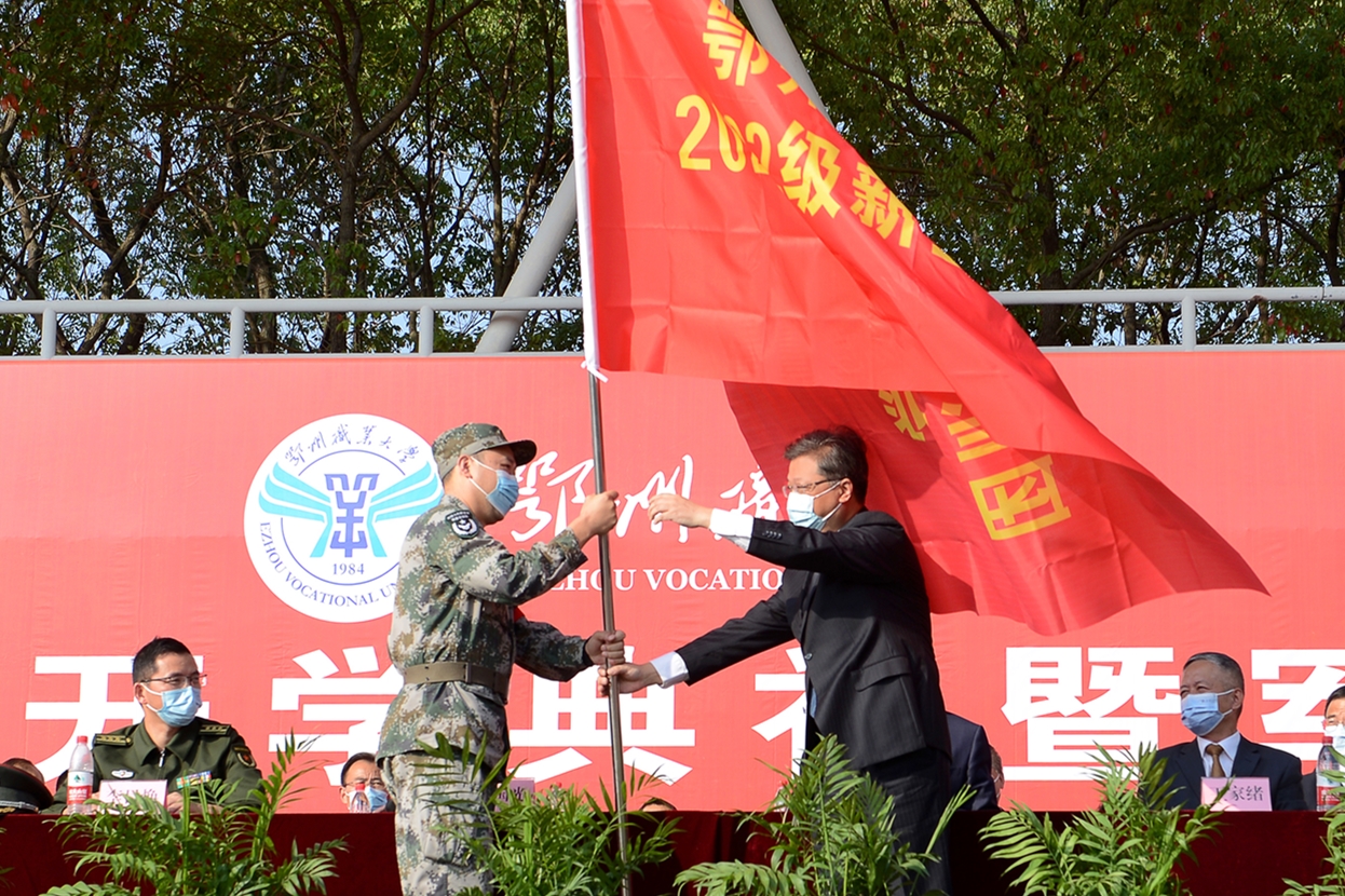 本网讯(记者 何建华 学生记者 蒋丽/文 闫元鑫 黄利娇 苏景盛/摄)11月1日,我校2022级新生开学典礼暨军训开营仪式在西区体育场隆重举行。校党委书记万国光出席开营仪式并向军训团授旗,校长何保华致辞。鄂州军分区党委常委战备动员处处长李目焕、武昌职业学院陆军二大队大队长谭联勇、全体在校领导及各院(部)、处室主要负责人出席开营仪式。