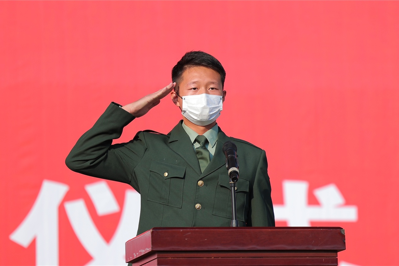 万国光向新生军训团授旗,并宣布2022级新生军训正式开始。