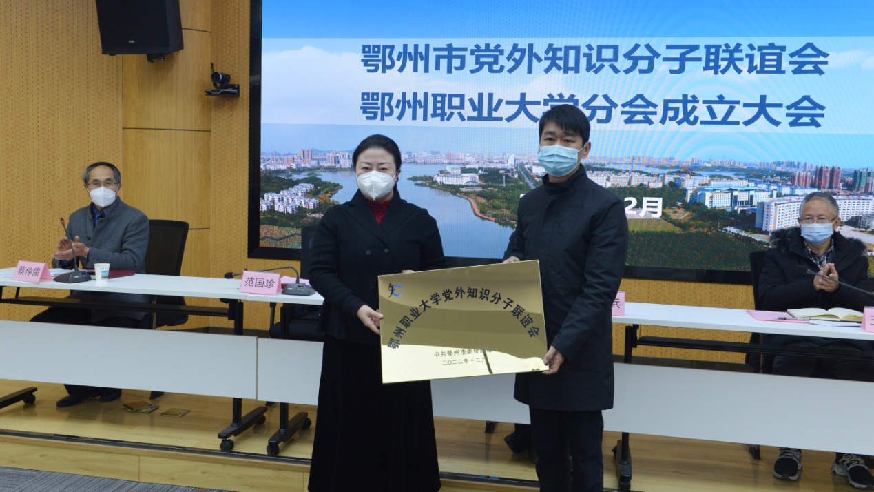 本网讯(记者 双全)12月28日上午,鄂州市党外知识分子联谊会鄂州职业大学分会在图书馆一楼会议室成立。市统战部常务副部长、台办主任杜红兵,校党委副书记、副校长王家绪等到场祝贺。市统战部副部长范国珍为鄂州职业大学党外知识分子联谊会授牌。