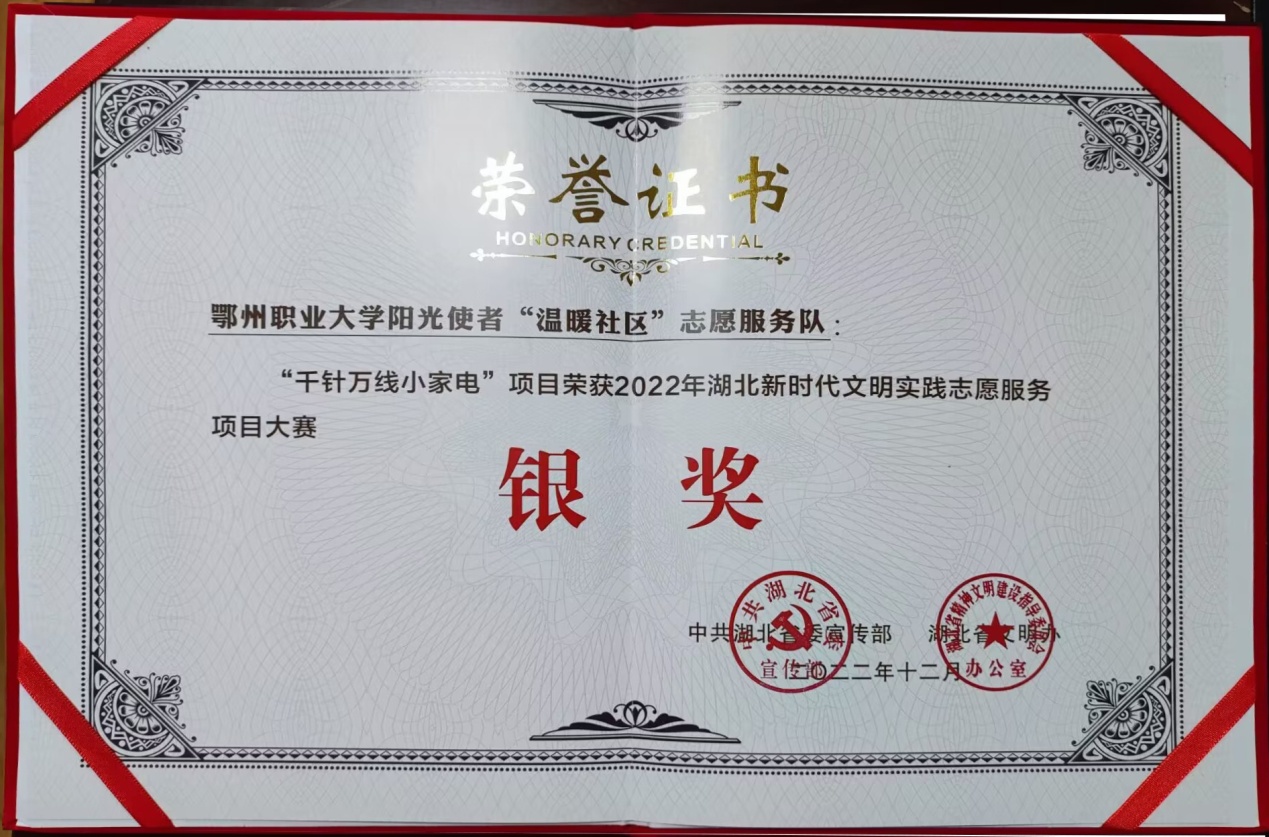 本网讯(记者 何建华)近日,2022年湖北新时代文明实践志愿服务项目大赛评选结果揭晓,由鄂州职业大学阳光使者“温暖社区”志愿服务队申报的“千针万线小家电”便民志愿服务项目荣获银奖。
