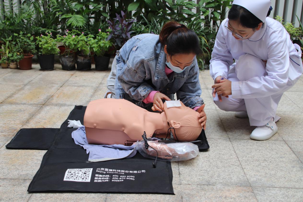 许多医学生都参与进来协助教学,给宿管阿姨做示范,手把手地指导她们正确掌握心肺复苏术和海姆立克法急救法。