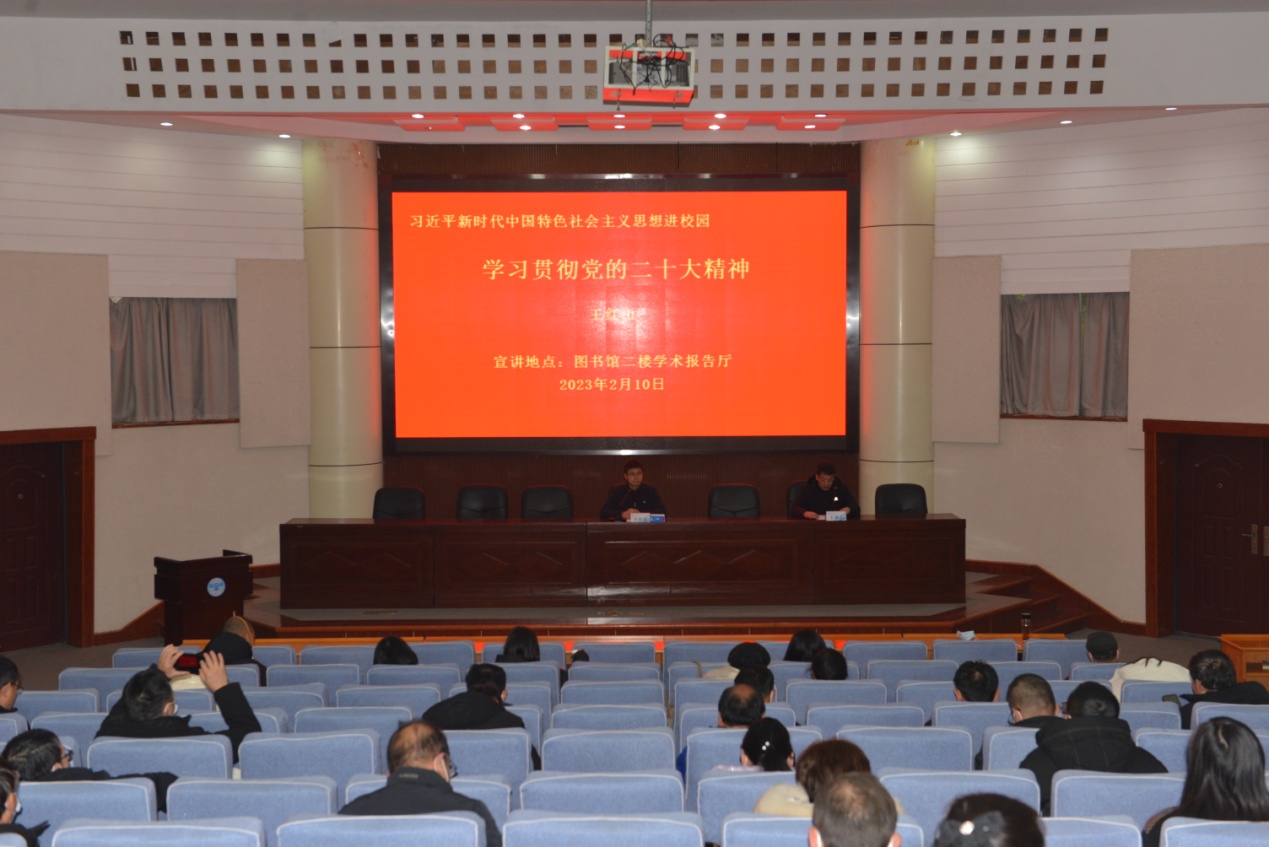 本网讯(记者 何建华)2月10日下午,副校长王红山以“防范化解网络意识形态安全风险”为题在图书馆学术报告厅为全体党员干部宣讲党的二十大精神。