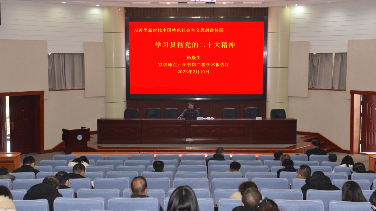 本网讯(记者 何建华)2月10日下午,副校长杨殿生以“领会精神,把握要义,谱写新时代学校高质量发展新篇章”为题在图书馆学术报告厅为全体党员干部宣讲党的二十大精神。