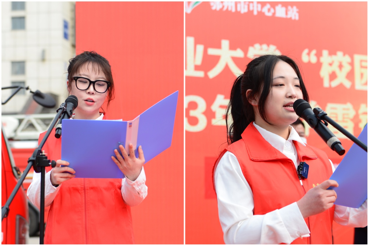 无偿献血志愿服务队志愿者代表我校学子范诗语宣读了无偿献血倡议书,号召广大青年积极参与无偿献血,以实际行动践行“奉献、友爱、进步、互助”的志愿精神,展现新时代的雷锋风采。