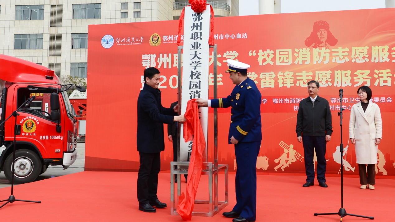 市消防救援支队支队长刘俊、副校长马凌军共同为我校“校园消防志愿服务队”揭牌。