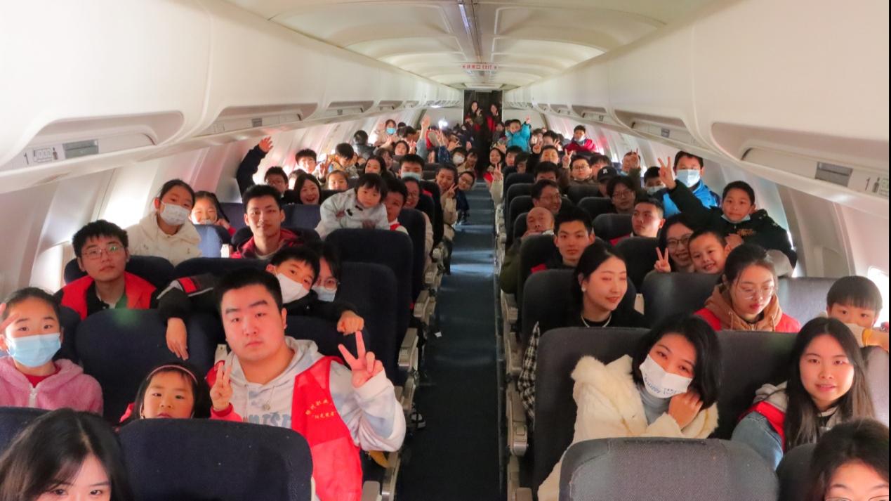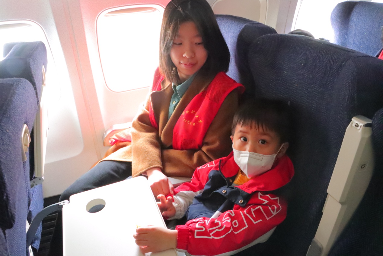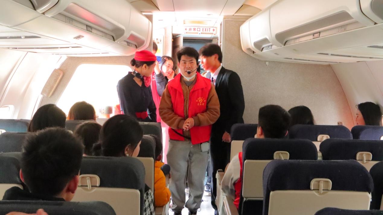 在机舱里坐下后,小朋友们瞬间化身为好奇宝宝。“为什么飞机是白色的?”“窗户为什么是椭圆的?”“为什么有些物品不能带上飞机?”“乘客座椅上方的那些按钮有什么用?”……由学院空乘专业师生担任的“空乘人员”一一向大家解答,并详细讲解了飞机机组的工作流程、机上安全设备的使用、空中安全知识普及等内容。